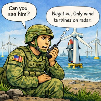 Large floating offshore wind installations introduce well-known radar complications. Hundreds of turbines, each taller than skyscrapers, create clutter, reflections, false detections, and blind spots, that degrade civilian aviation systems, weather radar, and military sensors.