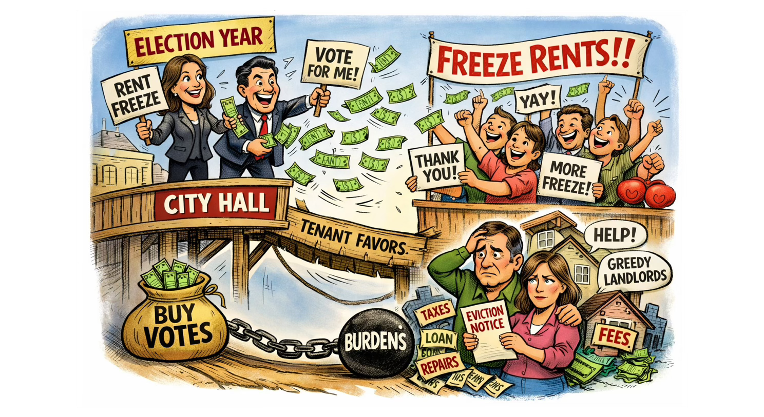 At the same time, so-called “high-risk tenants,” those with poor credit, unstable income, or little savings find it harder than ever to secure housing. Why? Because landlords are not willing to take chances since they can no longer remove a bad tenant. Yet property taxes, mortgages, insurance, and maintenance never stop.