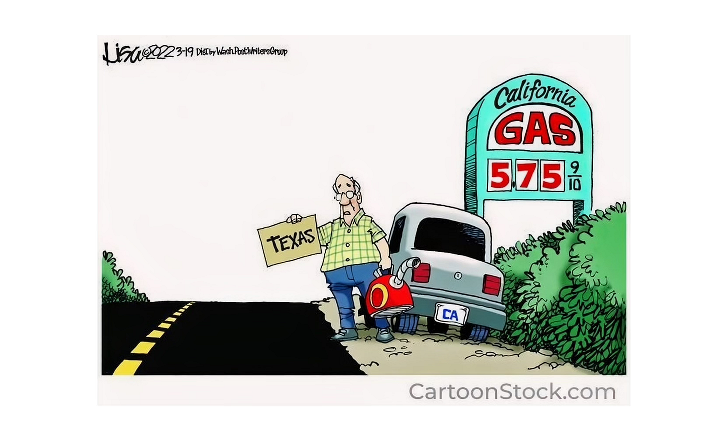 Regardless, nothing is going to change, even if gasoline hits $8-10 per gallon, as predicted. California is determined to transition away from gasoline and other fossil fuels faster than our economy and consumers can withstand to live without it. In all wars, there is the phenomenon of collateral damage, and you are it!